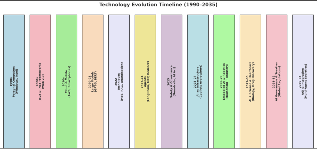 Just look at the curve from 1990 onwards: the personal computer defined a decade, frameworks like Java and .NET carried us through the 2000s, and cloud computing matured over nearly ten years. Yet from 2020 onwards, AI has compressed the same scale of transformation into scarcely five years—models, techniques, agents, and now safety and governance. The acceleration is unmistakable.